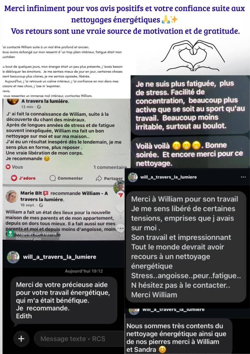 Leurs avis authentiques sont la meilleure preuve de la qualité des nettoyages énergétiques. J’espére que leurs témoignages vous aideront à faire votre choix en toute sérénité.